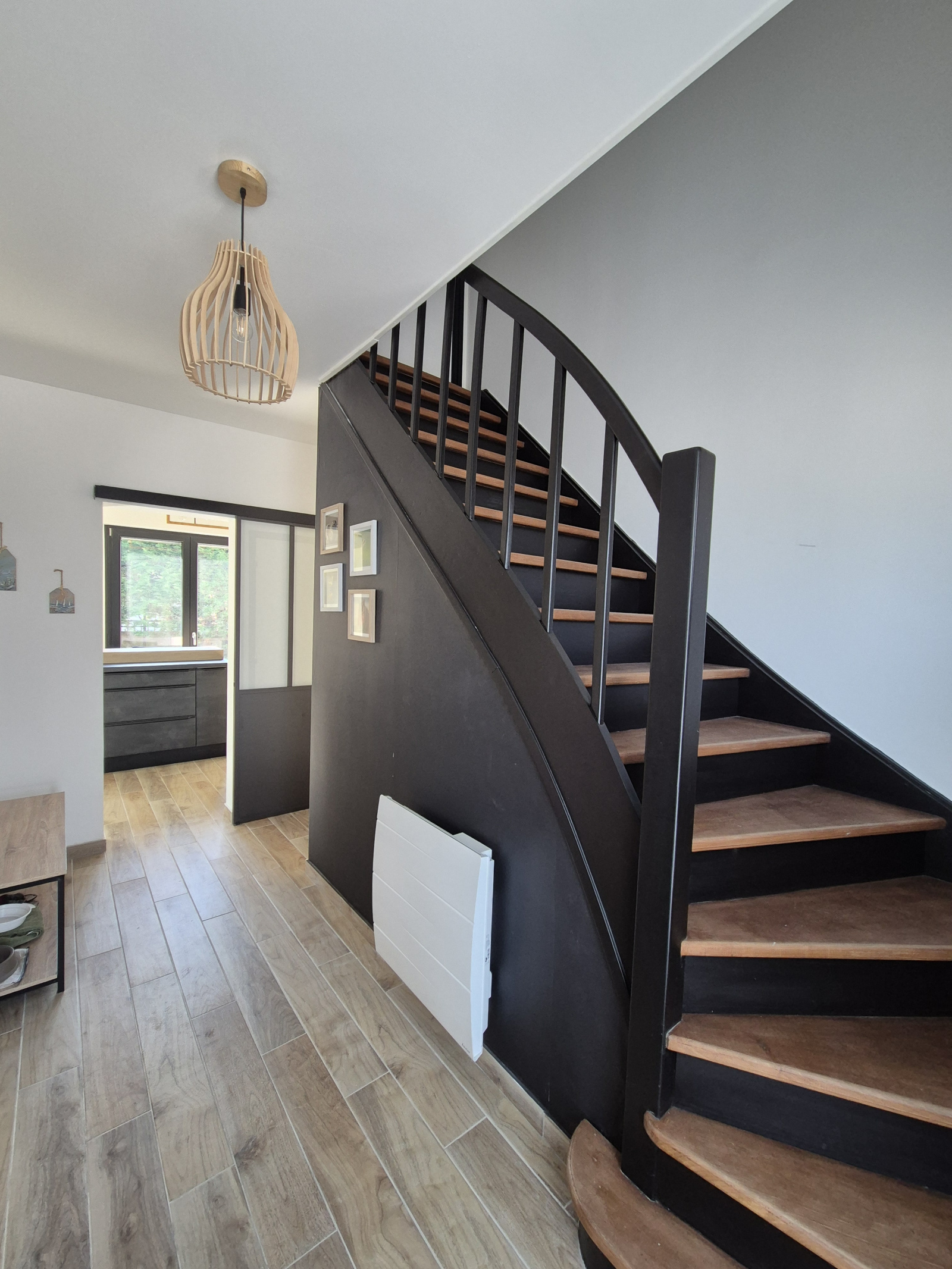 Cette charmante maison rénovée de 130 m² comprend : une entrée, salon, séjour, cuisine, un couloir distribuant : 2 chambres, salle d'eau avec WC.