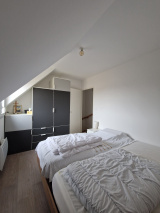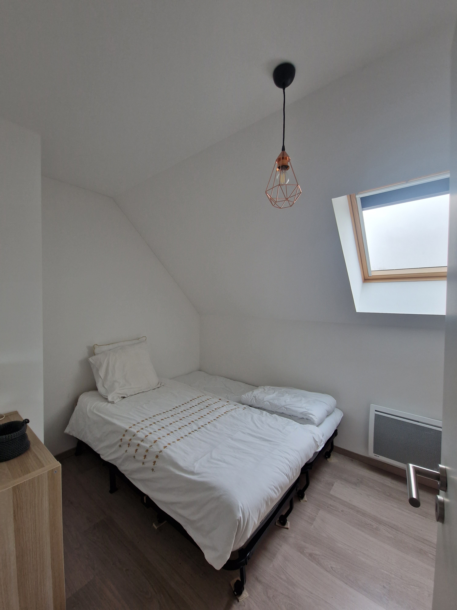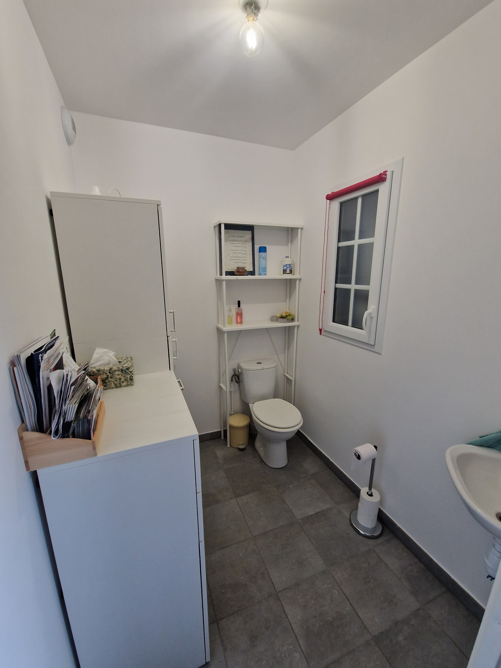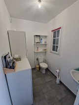 La maison est composée d'une entrée, un séjour-cuisine, un wc, à l'étage un palier desservant 2 chambres et une salle de bains.